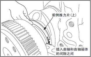 (2) 前側推力片( 上)的油槽面朝發動機的前側,在三菱S6R柴油發動機曲軸和三菱S6R柴油發動機三菱S6R柴油發動機曲軸箱的空隙之間插入前側推力片( 上)。