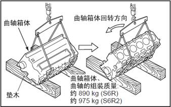 將三菱S6R柴油發動機三菱S6R柴油發動機曲軸箱放置在回轉臺上翻轉。不使用回轉臺時,在三菱S6R柴油發動機三菱S6R柴油發動機曲軸箱上掛上鋼絲索,在鋼絲索和三菱S6R柴油發動機三菱S6R柴油發動機曲軸箱體之間填入墊木或布,用起吊機吊起,然后橫倒放置在枕木上。重新掛鋼絲索,在枕木上將三菱S6R柴油發動機三菱S6R柴油發動機曲軸箱體翻轉恢復常規放置狀態。