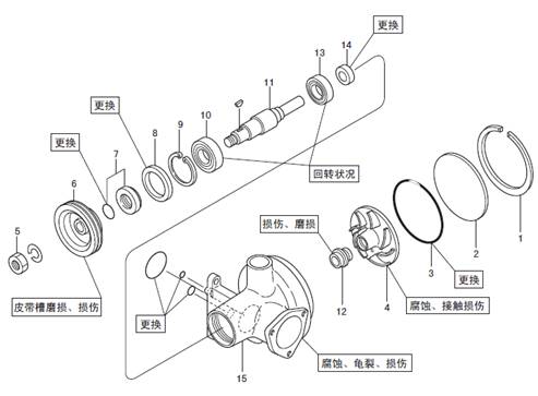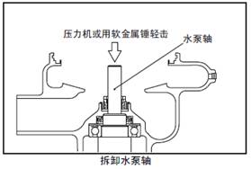 拆卸皮帶輪側軸承瓦的卡環,用壓力機或軟金屬錘輕擊,將水泵軸和軸承瓦一起取出。
