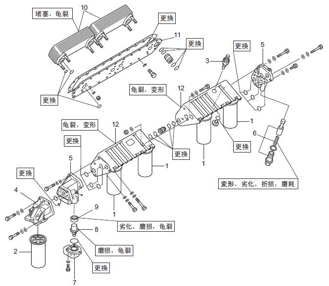 2.10 潤滑油濾清器、潤滑油濾清器報警器、釋放閥、左側潤滑油冷卻器的組裝組裝時的順序和解體時相反。潤滑油的通道用清洗油充分清洗,用高壓空氣吹干。