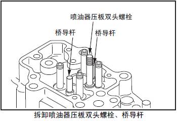 拆卸時(shí)參照「三菱R16柴油發(fā)動(dòng)機(jī)本體的檢測、修理」的「三菱R16柴油發(fā)動(dòng)機(jī)噴油器壓板雙頭螺栓、橋?qū)U的檢測,更換」項(xiàng)。