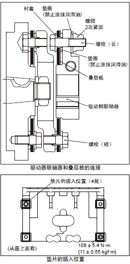 (c) 驅(qū)動器聯(lián)軸器和疊層板的配合面如有雜質(zhì)嵌入會引起打滑或損傷,使用前螺栓、襯套和墊圈要清洗干凈。