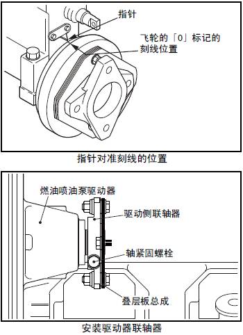 (3) 連接疊層板、驅(qū)動器聯(lián)軸器,用螺栓臨時固定。這時,確認(rèn)在No.1、7 壓縮上死點位置處時三菱R16柴油發(fā)動機燃油噴油泵三菱R16柴油發(fā)動機飛輪的記號「0」的刻線在指針附近。