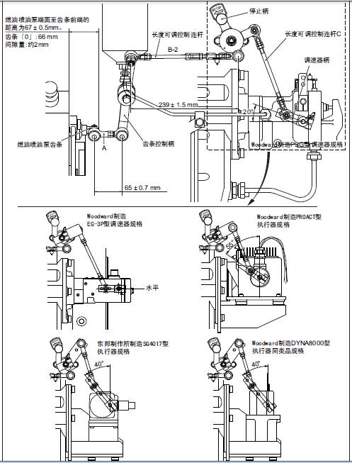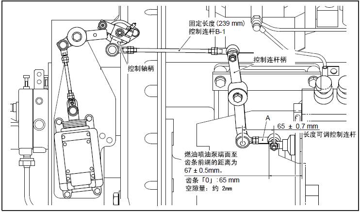 (3) 左氣缸側(cè)用可調(diào)長度控制三菱R16柴油發(fā)動機連桿B-2 調(diào)整至239 mm 臨時鎖緊,和有鋸齒孔的停止柄連接。確認(rèn)兩氣缸側(cè)的三菱R16柴油發(fā)動機燃油噴油泵齒條處于「0」位置,油門柄和套管、回程彈簧一起和控制軸的鋸齒孔連接。