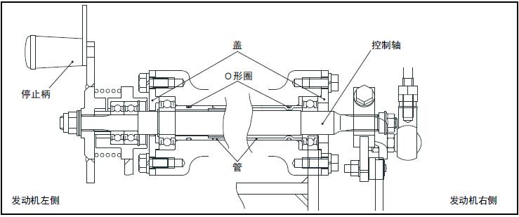 (3) 控制軸的左側(cè)端部,和球軸承、卡環(huán)、端板一起,安裝連接調(diào)速器執(zhí)行器的三菱R16柴油發(fā)動機連桿柄。
