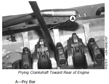 4. Gently pry the crankshaft as far forward as possible.Note indicator reading. If end play is not withinspecifications, install new thrust bearing.