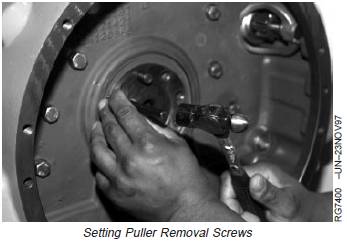 1. Place and center JDG645E Rear Crankshaft OilSeal/Wear Sleeve Puller cap screws and driver plateassembly onto crankshaft rear face. Then, using snapring pliers, set the thinner shoulder of ring tool betweensleeve flange and seal case.