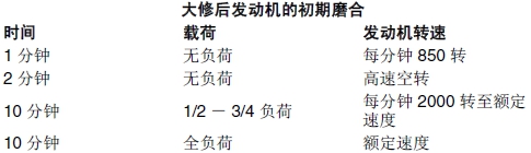 重要提示: 在磨合初期,定時(shí)檢查機(jī)油壓力和冷卻液溫度。還應(yīng)該檢查燃油、機(jī)油或冷卻液是否有泄漏跡象。一次全負(fù)荷運(yùn)轉(zhuǎn)時(shí)間不能超過 10 分鐘。