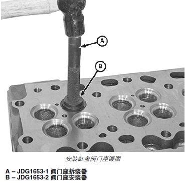 1. 用 JDG1653-1 閥門座孔拆裝器(A) 和 JDG1653-2 閥門座孔鑲?cè)Π惭b器(B) 安裝缸蓋閥門座孔鑲?cè)ΑS?JDG1653-2 閥門座安裝器的一端安裝進(jìn)氣閥門座鑲?cè)Γ昧硪欢税惭b排氣閥門座鑲?cè)Α?/P>