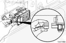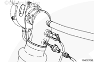 鑰匙開關位于“OFF”(斷開)位置。 從渦輪增壓器控制閥上斷開電氣線束。 為了拆下接頭,將食指放在接頭脫扣裝置上,將拇指放在接頭上,同時用食指壓脫扣裝置,如圖所示。 向里按脫扣裝置并且抓住插頭用力拉來拆下接頭,如圖所示。