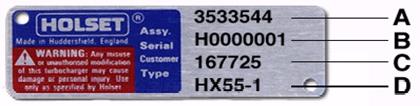 A = 增壓器組件號,B = 增壓器系列號,C = 客戶零件號,D = 增壓器型號 ,