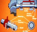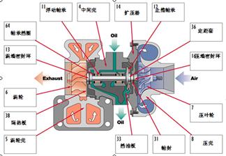 康明斯增壓器的渦輪端:1)渦輪殼接到發動機排氣管道上,2)廢氣驅動渦輪殼中的渦輪葉輪,3)渦輪葉輪帶動同軸上的壓葉輪