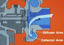 康明斯增壓器的壓氣機端:1)越多的廢氣通過渦輪殼,渦輪葉輪就轉得越快,2)隨著渦輪轉速的增加,壓葉輪轉速也增加,這樣更多的空氣通過空濾器后進入壓殼,3)轉速越快吸進去的空氣越多,空氣進入壓殼后通過壓葉輪及擴壓區。4)壓葉輪及擴壓區使空氣壓力增大并壓入發動機
