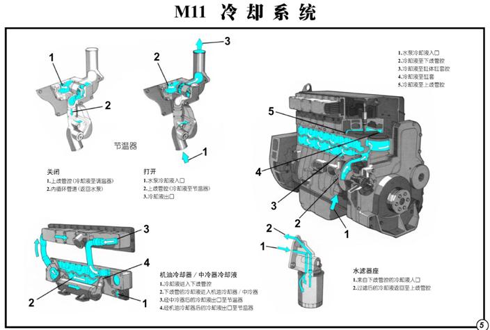 由散熱器、水泵、氣缸體水道、氣缸蓋水道、出水管、節溫器、水濾器、中冷器、機油冷卻器、以及選用件空氣壓縮機、液壓油冷卻器。
