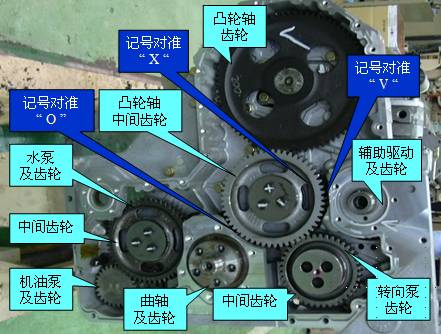 1.正時齒輪系:由曲軸齒輪、凸輪軸齒輪、輔助驅動齒輪以及中間齒輪等構成;由曲軸齒輪將運動傳遞給凸輪軸齒輪、輔助驅動齒輪,并由正時記號建立相互間的轉角關系,其中心距和齒側間隙由設計保證,裝配時勿需調整。