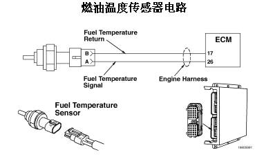 ECM 使用燃油溫度傳感器監(jiān)測燃油溫度。ECM 監(jiān)測觸針 26 上的電壓并將它轉(zhuǎn)換成溫度值。燃油溫度數(shù)值由 ECM 用于發(fā)動(dòng)機(jī)保護(hù)系統(tǒng)。