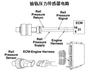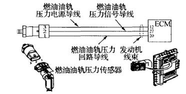 安裝在高壓燃油共軌內(nèi),其功能是:ECM利用該傳感器信號確定油軌中的燃油壓力,同時(shí)利用它來計(jì)算燃油供油量,工作范圍在0~1500 Ba,。傳感器出現(xiàn)故障將導(dǎo)致發(fā)動(dòng)機(jī)動(dòng)力下降、轉(zhuǎn)速降低甚至停車。
