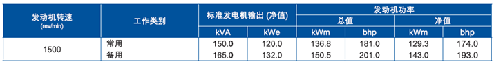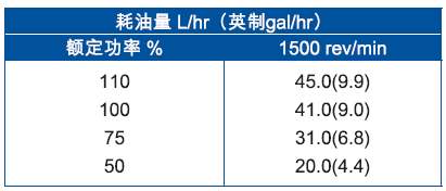 上表所有額定功率數(shù)據(jù)均為配備標(biāo)準(zhǔn)尺寸風(fēng)扃與驅(qū)動器比率的發(fā)動機(jī),ISO/TR 14396/IS0 8528條件下操作時數(shù)據(jù)。有關(guān)上述條件以外操作的數(shù)據(jù)請咨詢珀金斯公司,Perkins提供的性能公差為±5%。電氣參數(shù)假設(shè)功率因數(shù)為0.8與發(fā)動機(jī)效率90%。