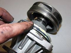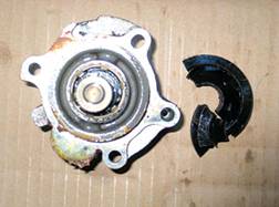 (5)水封 作用是密封冷卻液以免泄漏,同時將冷卻液與水泵軸承隔離,以保護軸承。目前水泵上已經廣泛使用了雙層陶瓷水封,2片同軸安裝的陶瓷水封被螺旋彈簧壓緊貼在一起。與橡膠水封相比,陶瓷水封更耐磨損,使用壽命更長,但是也存在容易被冷卻液中的硬質顆粒擦傷的缺點。雖然水封的加工得到了不斷的改進,但是水封損壞導致水泵漏水仍然是水泵損壞的主要原因。