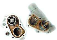(1)殼體 水泵殼體由鑄鐵或鑄鋁制成。鑄鐵殼體壁厚且質量大,很多鑄鐵殼體上還帶有部分水道和節溫器安裝室,這使得殼體的重量進一步增加。大多數水泵采用了鑄鋁殼體,而且殼體的尺寸越來越小,很多殼體已經不再具有水道的功能。