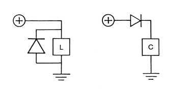 左圖為L-電路和C-電路續流二極管的接法, 對于存在L-電路和C-電路的地方必須接續流二極管,以防止脈沖電壓的產生,從而引起電路其它元件的損傷.