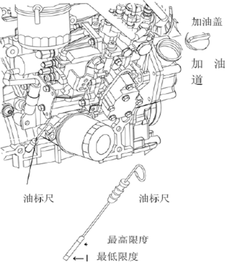 調整機器位置水平后,將油量計完全插入,測量油量高度.如果發動機開機后已加油,應在發動機停機后10分鐘以后檢查,確保機油回到機油盤中.