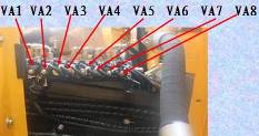 9個先導壓力傳感器,從左側立板方向到挖掘機左側方向順序分別為(如圖):動臂下降壓力傳感器,信號線為207號線  鏟斗卸載壓力傳感器,信號線為204;鏟斗挖掘壓力傳感器,信號線為205; 動臂提升壓力傳感器,信號線為206 ; 左行走壓力傳感器線號為:200; 右行走壓力傳感器,信號線為201;  小臂挖掘壓力傳感器,信號線為203; 小臂卸載壓力傳感器,信號線為202; 回轉壓力傳感器,信號線為208