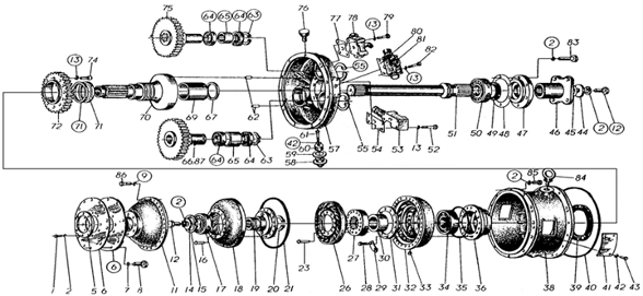 用銅棒將固定輸出齒輪的第一盤軸承,1打入,裝入定位套打入第二盤軸承(113),裝入孔用擋圈,三種輸出齒輪的軸承定位套擋圈下法一樣,然后裝入輸出齒輪