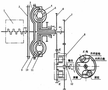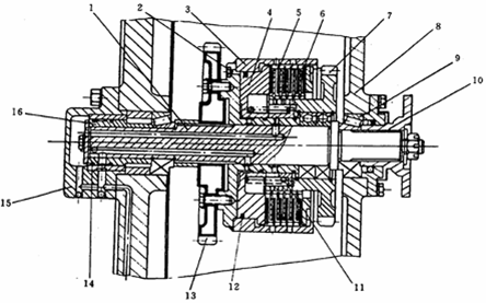 液壓離合器的離合器殼3和齒輪13用螺釘固裝在一起,齒輪13又通過內花鍵與輸入軸連接,構成離合器的主動部分。離合器部分則由活塞4、主動(外)摩擦片5、從動(內)摩擦片6、回位彈簧11、外端蓋以及檔圈等組成。離合器中的主動摩擦片通過外花鍵與離合器的殼體連接,從動摩擦片則通過內花鍵與從動齒輪連接。從動齒輪通過軸承支承在輸入軸上,并可相對于輸入軸轉動。