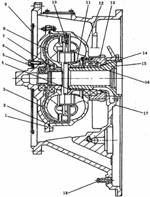 發動機的動力按如下路線輸入至泵輪:發動機飛輪 → 彈性板9 → 罩輪1 → 泵輪12。柴油機飛輪和彈性板9的外緣用雙頭螺柱連接,彈性板的內緣則用螺栓6與罩輪1相連。罩輪與泵輪12之間為了密封,應用了一個“O”型密封圈2,并用較多的螺栓連接,罩輪和泵輪聯接處用配合面定位,以保證泵輪與發動機曲軸的同心度。