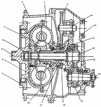 泵輪通過兩排球軸承16支承在導輪座上。裝配時,先將分動齒輪支承在導輪座的兩排軸承上,再用螺栓將泵輪與分動齒輪13相連。