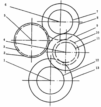 l—輸出軸  2—倒檔軸大齒輪  3—倒檔軸小齒輪 4—中間軸 5—倒檔軸  6—輸入軸   7—輸入軸I擋齒輪  8—輸入軸Ⅱ檔齒輪  9—中間軸I檔齒輪 10—中間軸Ⅱ檔齒輪  11—中間軸低檔齒輪   12—輸出軸高檔齒輪  13—輸出軸低檔齒輪BS428變速箱齒輪嚙合情況示意圖(從輸入端看)