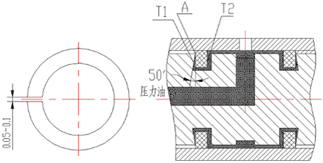 密封環12和14的安裝好壞和使用中的摩擦將影響操縱油的密封情況,從而影響離合器的工作,應此對密封環的安裝要予以足夠的重視。見密封示意圖。在軸上的槽中,靠外側一面有50‘的斜角,會使兩側的T1及T2面產生壓力差,T2面壓力稍大于T1面,在壓力差的作用下,緊壓在A點附近的一個小環形面上,達到密封的目的,并在A點附近產生相對轉動與摩擦。密封環的外圓因受密封環的張緊力,而壓在套的內圓面上。