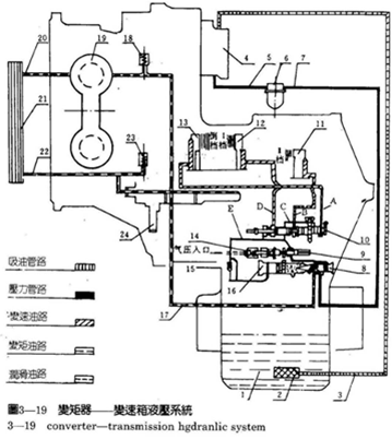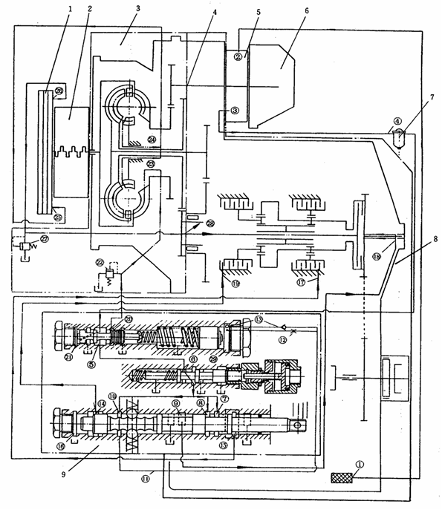 液力傳動油經變速泵輸出,經濾油器過濾后供給變速操縱閥(或減壓閥)。工作油液首先進入變速操縱閥的變速操縱油路,滿足變速要求,然后一部分油液再進入變矩器。