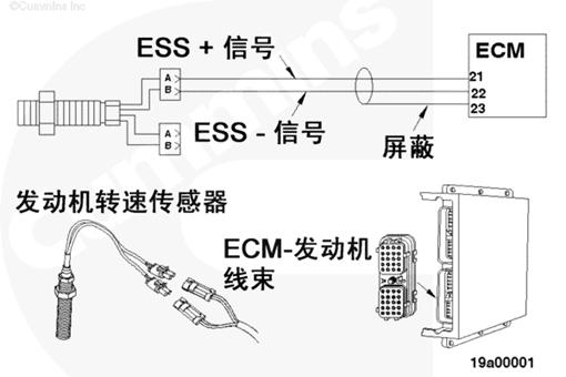 發(fā)動機(jī)線束電子控制模塊 (ECM) 接頭的發(fā)動機(jī)轉(zhuǎn)速傳感器 (ESS) 信號觸針 21 和 22 表明發(fā)動機(jī)轉(zhuǎn)速超過報警(停機(jī))閾值。 |
