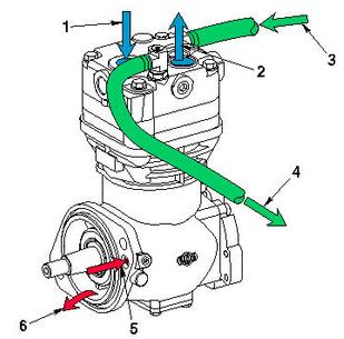空氣壓縮機連續運行,但有“負載”和“空載”兩種運行模式。工作模式由壓力驅動調壓器和壓縮機卸荷閥總成控制。當空氣系統達到預定壓力時,調壓器給卸荷閥總成施加一個空氣信號,使得卸荷閥打開或者關閉壓縮機進氣門,于是壓縮空氣停止流入空氣系統。當使用系統時,壓力下降。在預定壓力下,調壓器給壓縮機卸荷閥總成發出空氣信號,允許壓縮機再次向空氣系統泵入壓縮空氣。