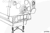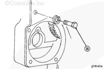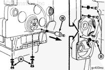 能夠拆下康明斯KTA柴油發(fā)動機齒輪室蓋前必須先拆下主定位銷。使用滑錘 (33) 或 5/16-18 in 螺釘或螺桿和舊活塞銷拆下定位銷。前蓋的底部 (34) 上有 5 個螺釘,背部 (35) 上有 3 個螺釘。拆下底部螺釘 (34) 和后面的螺釘 (35)。