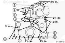 圖中所示為所有鑄鐵兩件式(船用)前齒輪室蓋的通用螺釘長度要求。(1) 至 (9) 的螺釘長度取決于所用的選裝件。所有螺釘都以美制英寸為單位。所有螺釘都為 3/8 x 16 UNC。