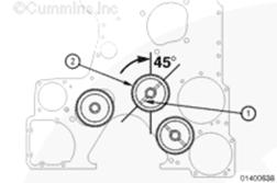 對準康明斯KTA柴油發動機凸輪軸惰輪軸 (2),以便使軸 (1) 的油道處于所示的垂直線的順時針45 度處。