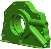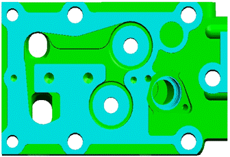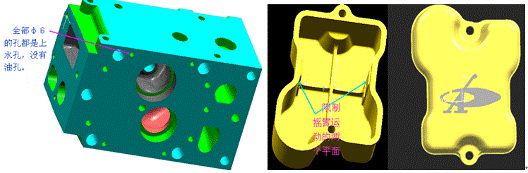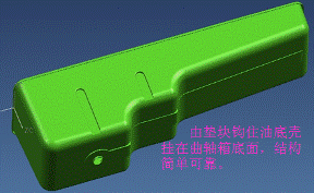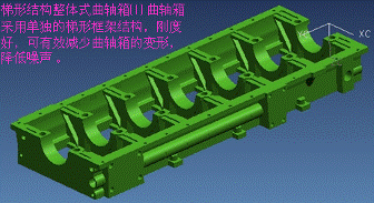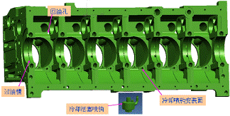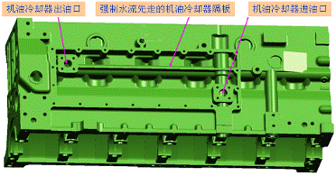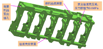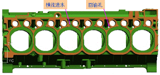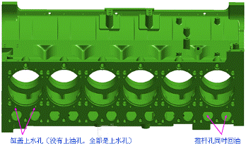 玉柴氣缸體-底面視圖:主油道通副油道的過渡由主軸承孔開槽來實現,不必另外布置油道,結構簡單。