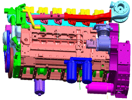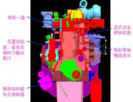 整體梯形結構曲軸箱,剛度好,有效減少曲軸箱變形,降低噪聲。 采用每缸一蓋結構,制造性好,廢品率低,維修性好。 內冷油道活塞、新型活塞環和缸套滿足了發動機性能和可靠性的要求,有效降低機油耗。 油、氣獨立回流和旋風式油氣分離技術使油、氣分離徹底。 后置齒輪室,使后端取力方便,并且使發動機外形更窄,可以適配各種重型車底盤。