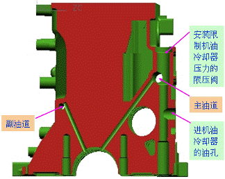主、副油道鉆兩個斜孔,并通過主軸承孔連通,實現副油道供冷卻噴鉤的機油和潤滑油泵的機油。