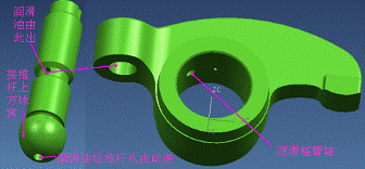 潤滑油從推桿上到調整螺釘,再經過調整螺釘上到搖臂調整螺釘孔,然后進入搖臂的搖臂軸孔,潤滑搖臂軸,構思巧妙,解決缸蓋不好上油的問題。