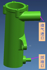 油氣有一定速度沿切線進入油氣分離器并做旋轉運動,在離心力的作用下,油滴被甩到分離器的壁上,由下面的回油孔回到油底殼油面以下