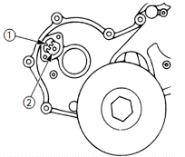 •          順時針方向轉到曲軸,使凸輪軸正時觀察孔指針①和凸輪軸正時齒輪標記“O”對齊