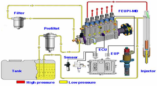由一汽集團公司(FAW)將德爾福成熟的電控單體泵(EUP)集成(Integration)為FEUPI電控直列泵噴油系統,ECU采用MOTOROLA,傳感器采用西門子。