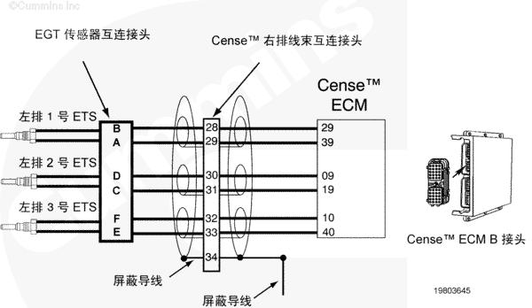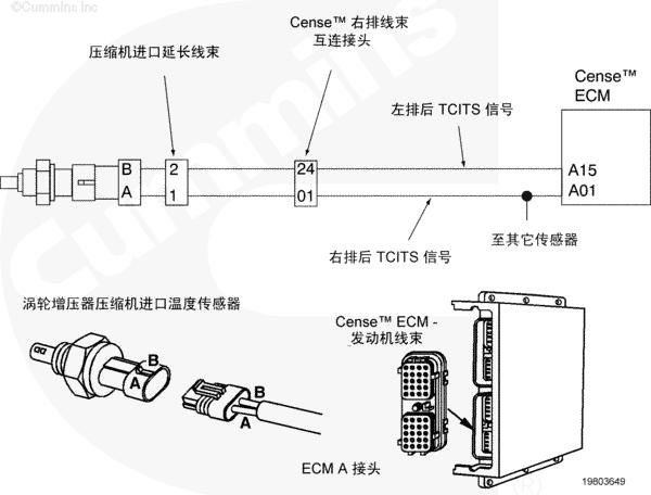 左排后渦輪增壓器壓縮機(jī)進(jìn)口溫度傳感器電路圖向 CENSE™ ECM 提供左排后渦輪增壓器壓縮機(jī)進(jìn)口溫度信號(hào)。