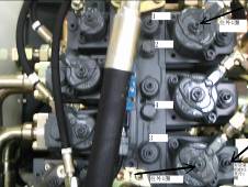 慢放行走操縱桿,使壓力降到150 bar時,先導(dǎo)壓力立刻上升到場25 bar,否則調(diào)節(jié)行走換檔閥塊上邊的調(diào)節(jié)螺釘。如下圖