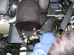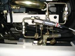按下控制屏上“F3”鍵,和“兔子開關(guān)”按鈕,快速收回斗桿,讀出回油壓力,應(yīng)為110 bar,如果不對,就調(diào)斗桿油缸上的節(jié)流閥,使之達(dá)到目的100 bar