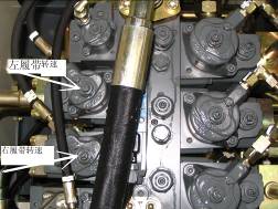 ⑴把排氣管先接到下圖中標(biāo)⑴的測試口上排氣,等到流出的油液中沒有氣泡為止。擰下排氣管再接到下圖中標(biāo)⑵的測試口上排氣,動臂上下運動約7分鐘,直到流出的油液中沒有氣泡為止。